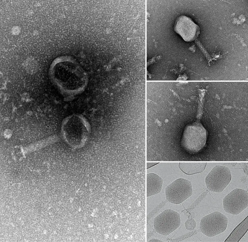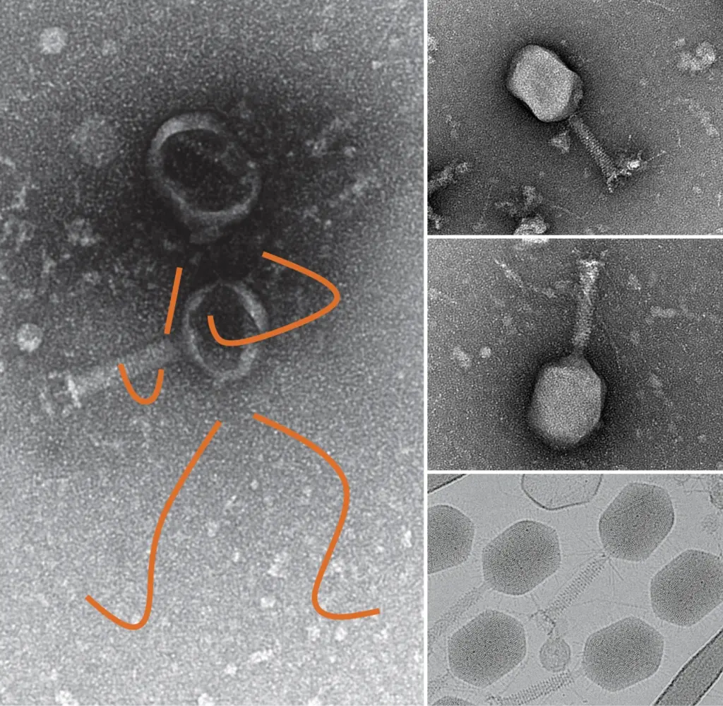 Phages T4 visualisés par microscopie électronique