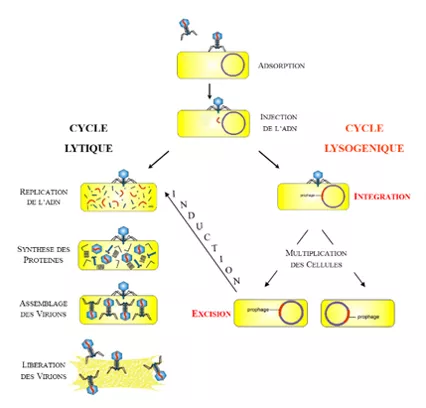 – les phages tempérés, comme le phage Lambda, peuvent gérer deux cycles de vie distincts, le cycle lytique et le cycle lysogénique. En fonction de différents facteurs comme l’état nutritionnel de la cellule hôte, la densité des cellules ou des phages, ou la communication avec les petites molécules, les phages tempérés sont capables de procéder à un cycle lysogénique entraînant l’intégration du génome viral à un seul site du chromosome de son hôte. Une fois intégré, le génome du bactériophage, appelé prophage, est répliqué passivement avec le chromosome bactérien et certains de ses gènes pourront dans certaines conditions être exprimés dans la bactérie.